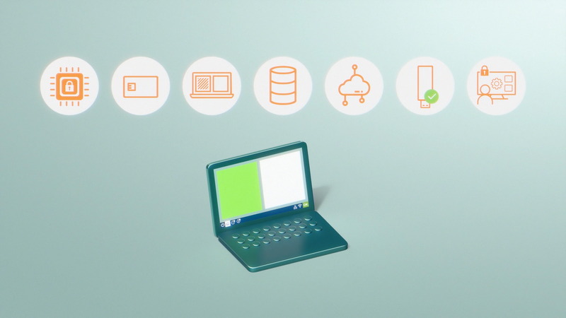 Statt auf klassische Illustrationen zu setzen, zerlegten wir in abstrahierter Form das Gerät in seine Bestandteile. Die Animation visualisiert die strikte Trennung der Arbeitsumgebungen sowie zusätzliche Sicherheitselemente des Notebooks. So wird die Funktionsweise der «Security by Segmentation» ästhetisch und präzise erlebbar.